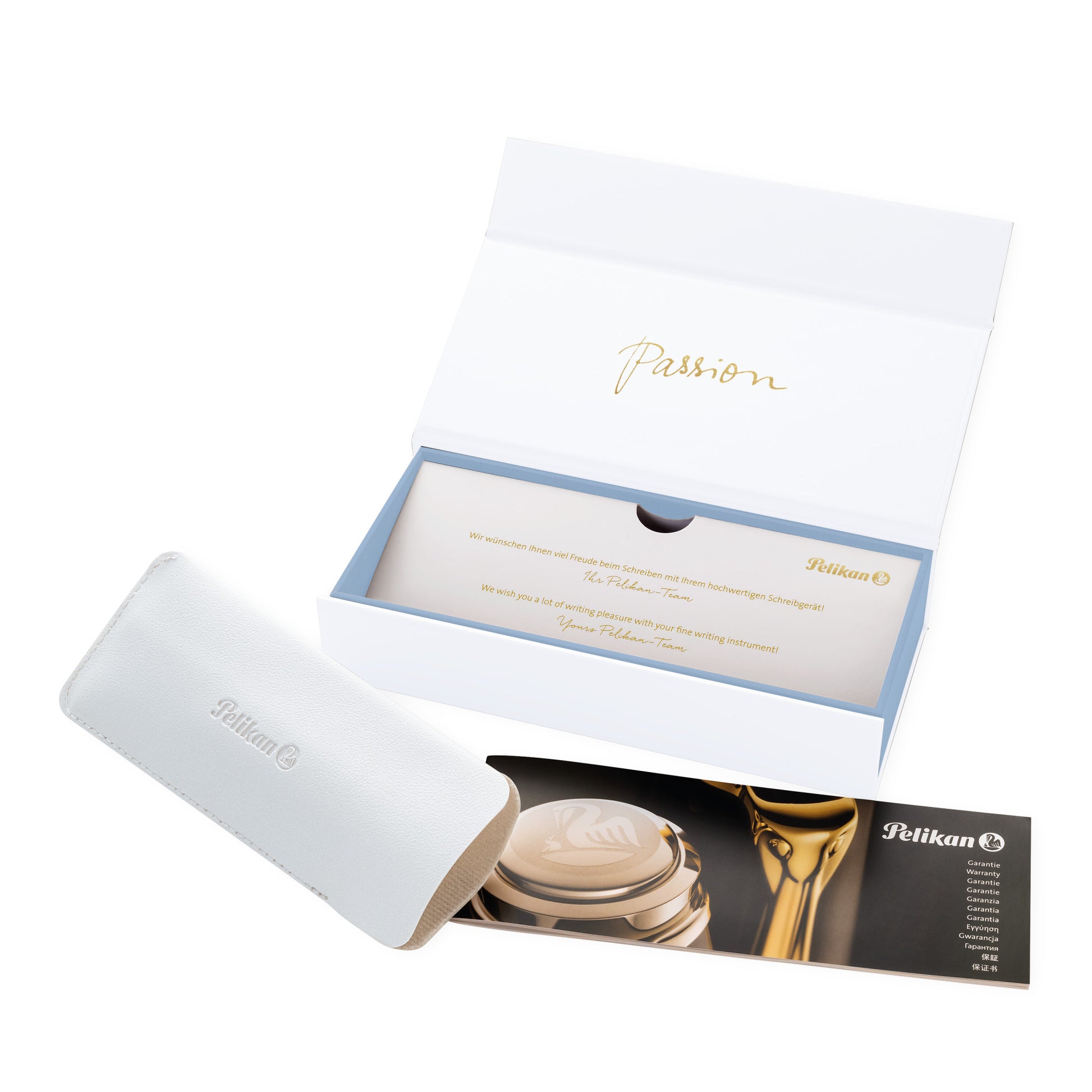 Una nuova leggerezza. Un delicato blu pastello si fonde con effetti perlati nel fusto, creando variazioni di colore sempre nuove. Il delicato materiale blu è semitrasparente e consente di vedere l'interno della penna stilografica. In combinazione con la pregiata resina bianca e gli elementi decorativi placcati in oro, il risultato è un equilibrato connubio tra design elegante e un'impressione cromatica rinfrescante. La penna stilografica a stantuffo è impreziosita da elementi decorativi placcati in oro 24 carati, come gli anelli e la clip a forma di becco di pellicano. La penna stilografica, con pennino in acciaio inossidabile placcato oro, offre una sensazione di scrittura morbida. Il pennino M ha un tratto medio ed è adatto a molti stili di scrittura; si adatta bene anche allo stile di scrittura di chi inizia a scrivere con una penna stilografica.